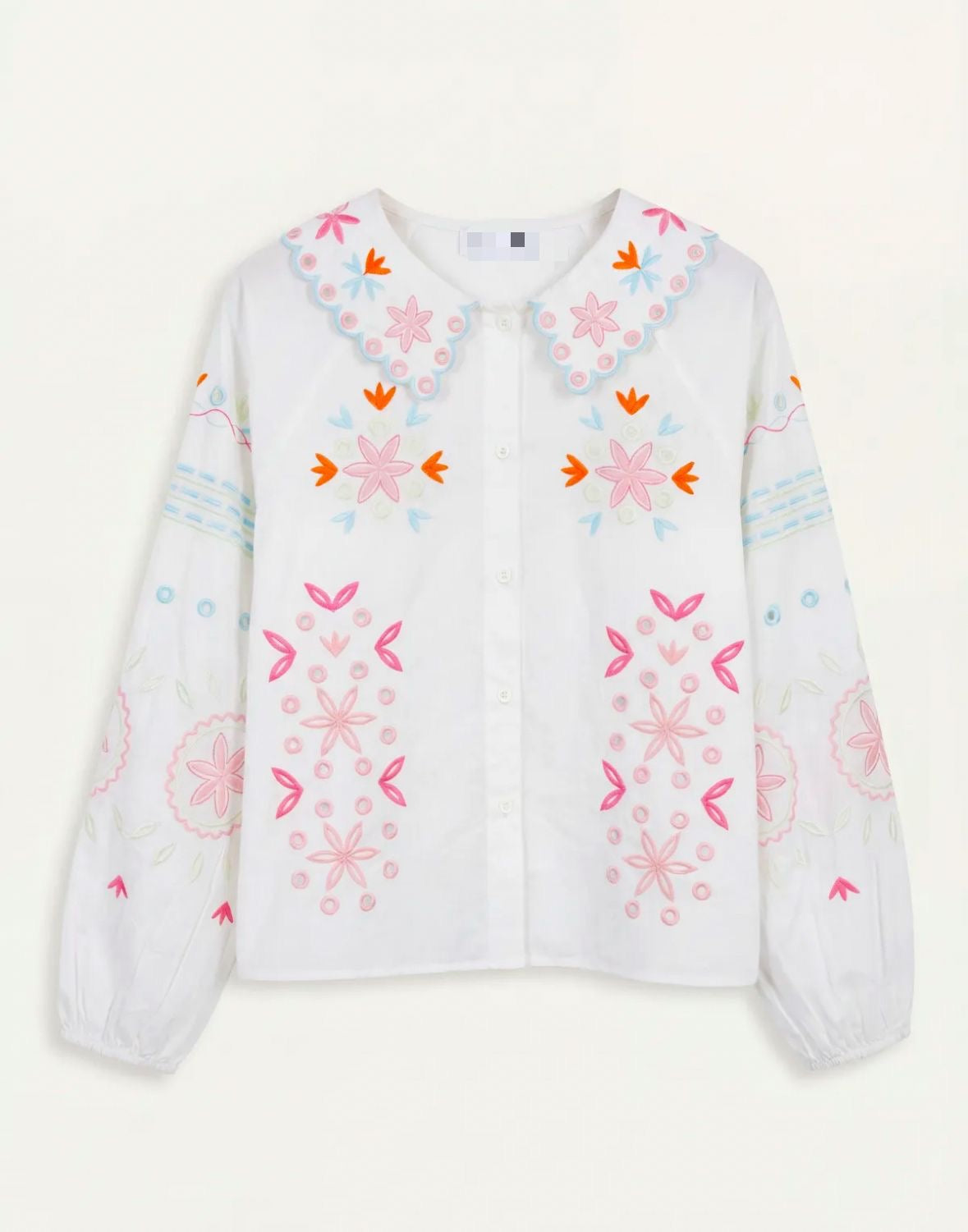 The Fleur blouse features a striking floral embroidery pattern, with a delicate scalloped edge collar, feminine bell sleeves with elastic. Set on a crisp white base, accented with a pretty palette of colours, creating a gorgeous transitional piece that will carry you effortlessly through the summer.