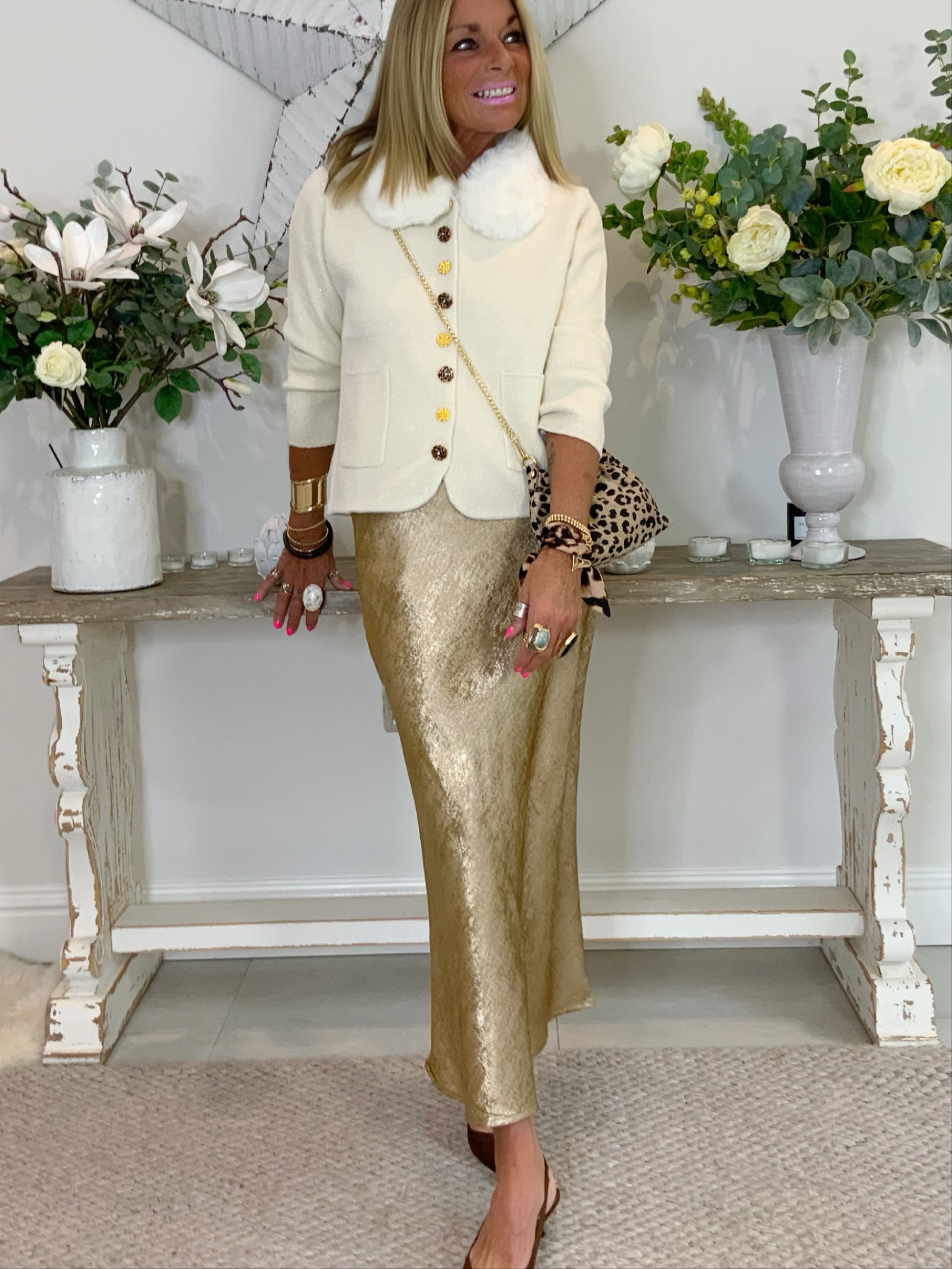 Style this foil bias-cut midi skirt with a fitted shirt/blouse for an easy formal look that meets any dress code, add knitwear and boots to dress down or sequins to glam up your look.