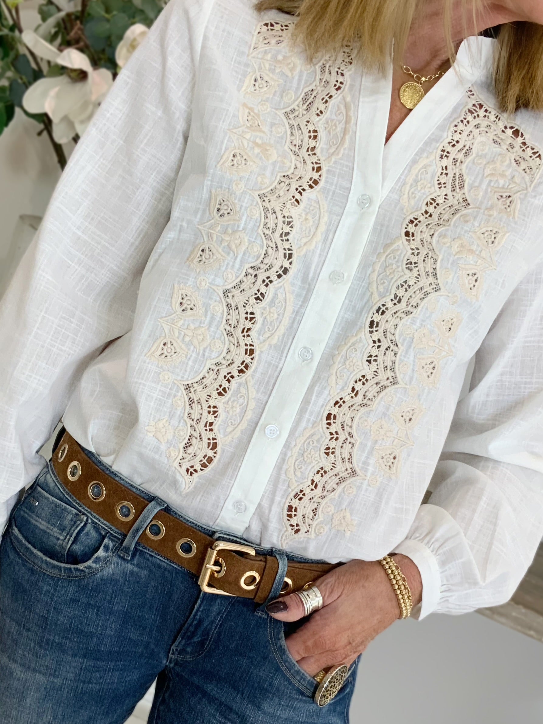 An everyday classic with a romantic touch. The Santorini white blouse features delicate crochet lace detail in a contrasting colour, adding texture to its breezy design.